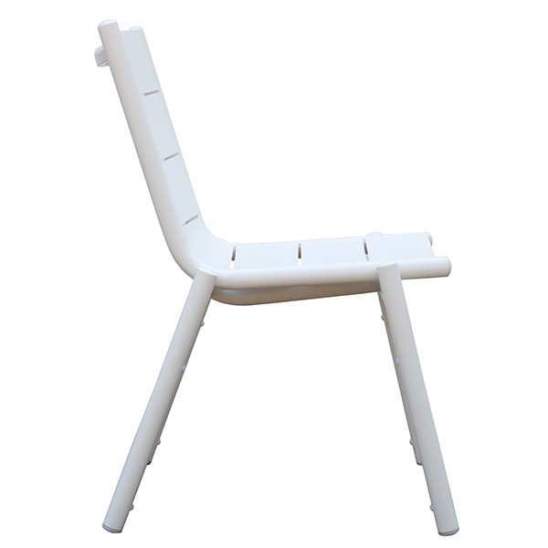De versie van de Aluminium Stilt Chair speelt de bias van de 100% aluminium look. Het combineert een witte aluminium buisstructuur met een wit gelakte aluminium lamellen.