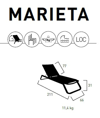 Voorzieningenkussens niet inbegrepenDe Marieta Zonnebank van Vlaemynck is een comfortabele en eigentijdse zonnebank ideaal voor het inrichten van een zwembadrand of terras. De structuur is gemaakt van gelakt aluminium, de basis in geïnjecteerd polypropyleen en de bekleding in technisch canvas voor buiten. Deze materialen geven het een hoge weerstand tegen externe omstandigheden en maken het een zonnebank die volledig is aangepast aan de zoute omgeving.