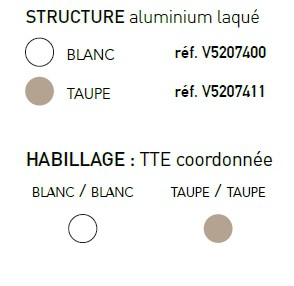 Gecoördineerde technische buitendoekbekleding: wit canvas voor witte structuur / taupe canvas voor taupe structuurStapelbaar en verstelbaar zonnebaden: 5 rugleuningposities waarvan één 100% vlak - Geïntegreerde zwenkwielen