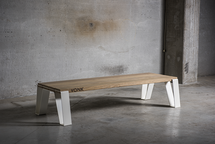 Stoel gerealiseerd in iroko FSCStructuur gemaakt van staal