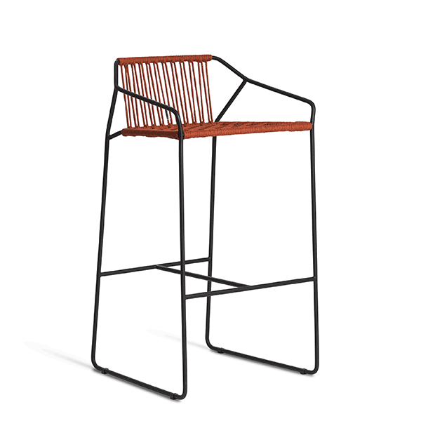 Hoge kruk met roestvrijstalen frame "power coated" afwerking en geweven synthetisch touw speciaal ontworpen voor gebruik buitenshuisOlefine en Diversatex garens onveranderlijk voor weer en UV