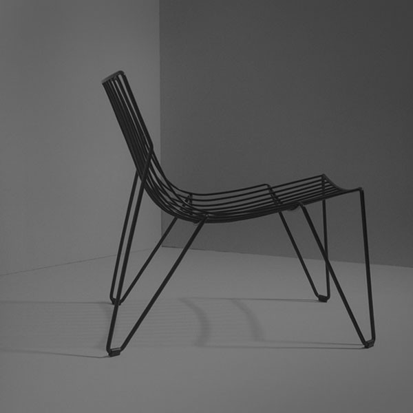 Deze lage fauteuil met staaldraadstructuur past zich aan elk type exterieur aan.