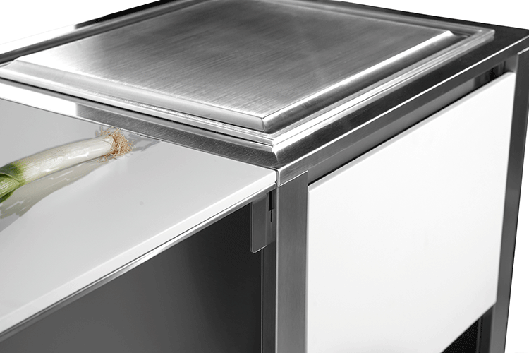 Afwerking beschikbaar in roestvrij staal, corian taupe en wit corian.