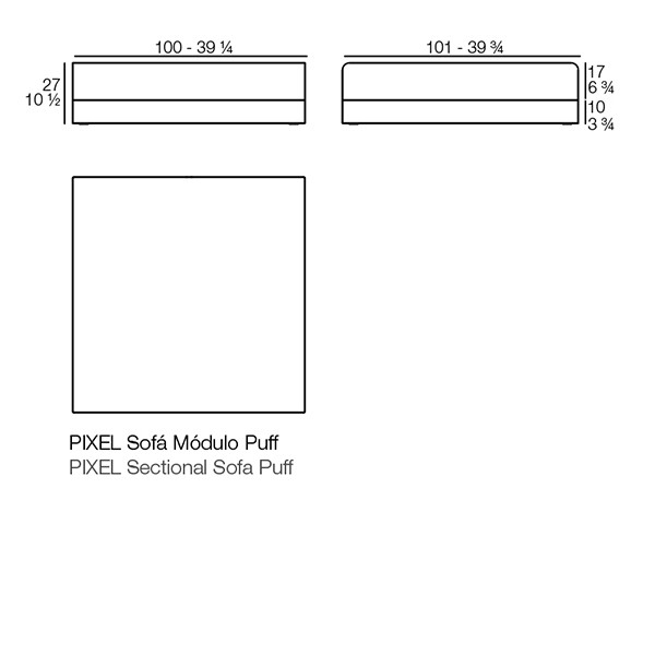 Deze poef wordt gecombineerd met de andere modules van de Pixel-collectie om een lineaire of hoekbank te creëren, afhankelijk van de ruimte en de behoeften van elke module (de verbindingsaccessoires tussen elke module zijn aanwezig).