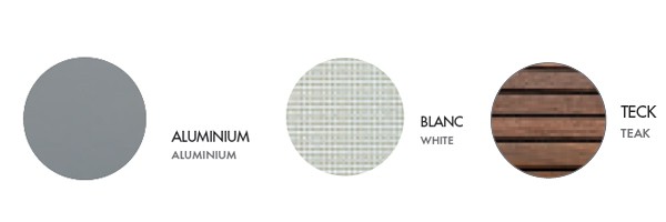 De thermo-gelakte aluminium structuur met semi-glanzende verf in aluminiumkleur en de lamellen, in teak en batyline of witte corian en batyline, geven het een sterke weerstand tegen weersinvloeden, UV en krassen.