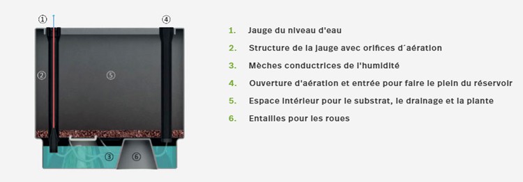 Afmetingen: 38 cm x 38 x H35cm-superieure interieur afmetingen: L28, 5 cm x b 28, 5 cm - gewicht: 4,5 Kg-water reservecapaciteit: 4 L - substraat capaciteit: 24 LDe pot is een hydrojardiniere : het is uitgerust met een dubbele pijp door die lucht circulatie is permanent en vergemakkelijkt de oxygenatie van het water op een manier dat de wortels herhaald de werking van de natuur.