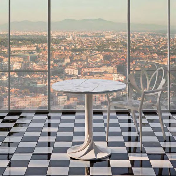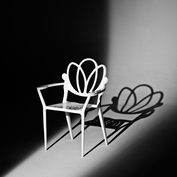 Zijn bestand in arabesken en haar jurk in wit gelakt aluminium geven het ongeëvenaarde elegantie en finesse.