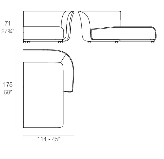 Deze chaise longue module met armleuning aan de linkerkant is gekoppeld aan de Suave modules: Centrale Module / Linker Module / Rechter Module / Rechter Chaise Longue Module