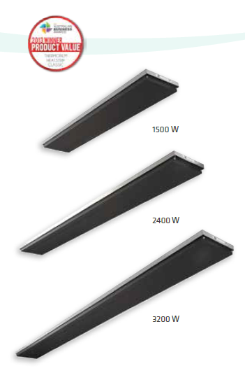 Beschikbaar in 3 afmetingen en bevoegdheden, 1500W, 2400W en 3200W, Stralende Heatstrip ontwerp past zich aan de ruimten en de beperkingen van elk.