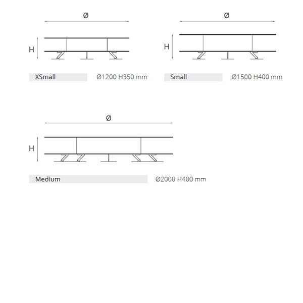 -XSmall: Ø120cm x H35cm - Gewicht: +/- 120KG-Klein: Ø150cm x H40cm - Gewicht: +/- 180KG